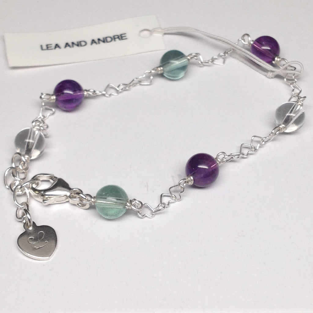 CLASSIC 7-Stone Amethyst/Green Fluorite/Clear Rock Crystal Interlocking Heart Bracelet