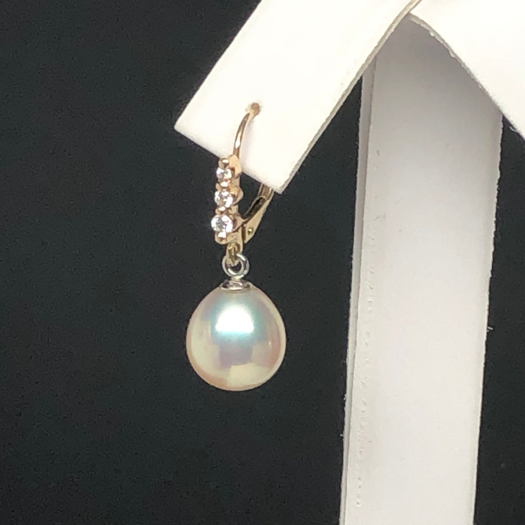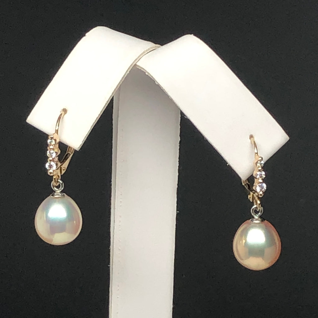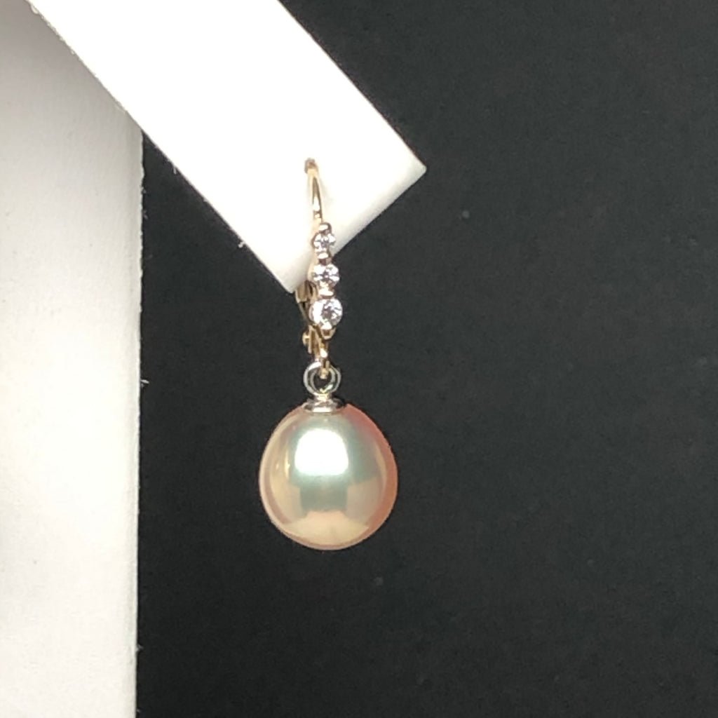 DESIGNER 9.5-10mm Metallic Peach/White Freshwater Pearl Drop Diamond Earrings, 14K Gold