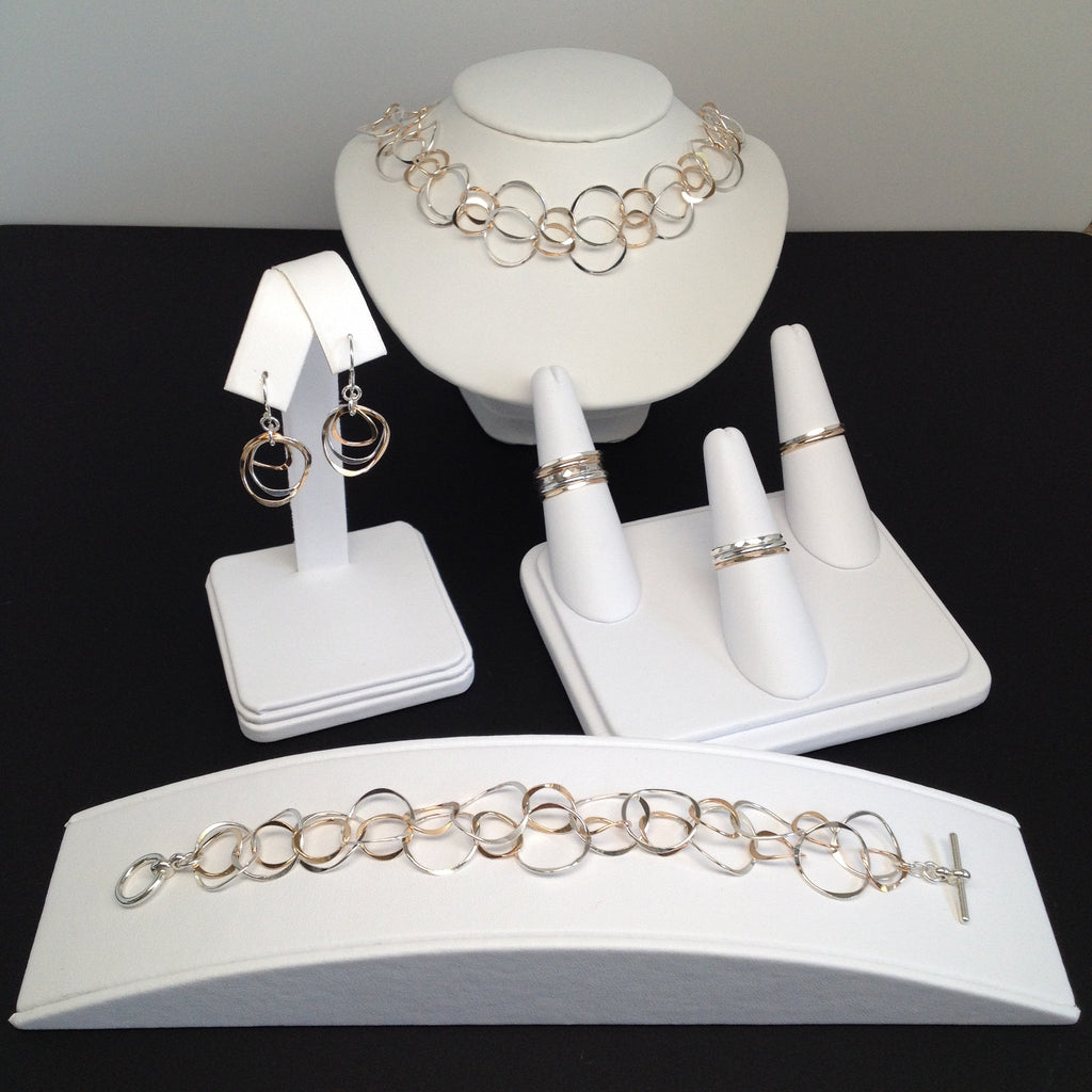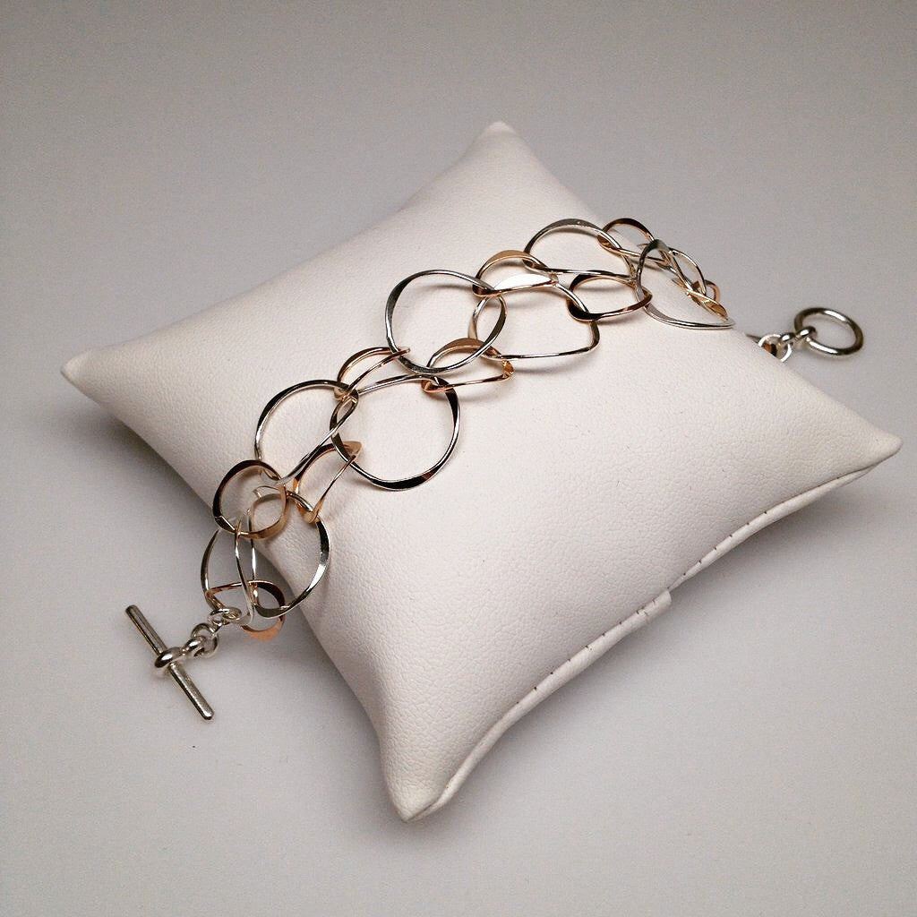 Part of the INTERLOCKING CIRCLES Collection. This two-tone double interlocking circles bracelet is very light weight. If you are looking for a statement bracelet that is not heavy, this is the one.