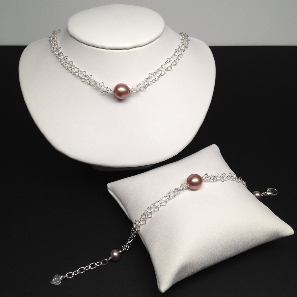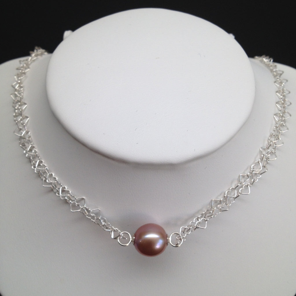 #DLFPSN1601Part of LEA AND ANDRE® Galaxy Collection. This beautiful double heart link necklace features one 9.5-10.5mm AAA lavender oval freshwater cultured pearl and two 6mm AAA lavender round freshwater cultured pearls. The color is natural and the pearls exhibit high luster.